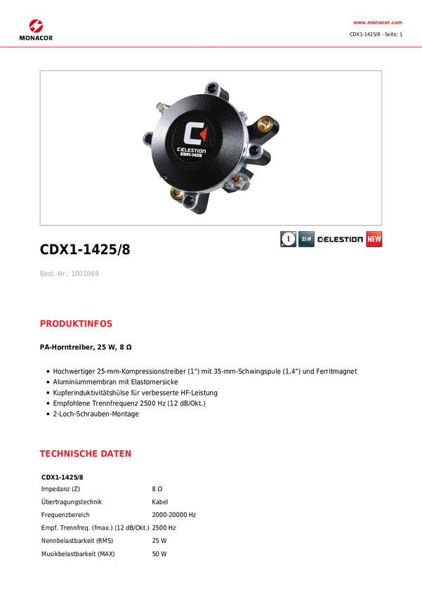 Monacor CDX1-1425/8 Sterownik tubowy PA Moc RMS=25 W 8 Ω