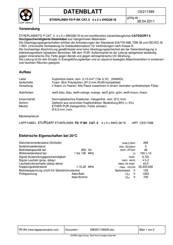 LAPP CE217489/100 Przewód sieciowy ETHERLINE FD P BK CAT.5, CAT 5, S/UTP, 100 m