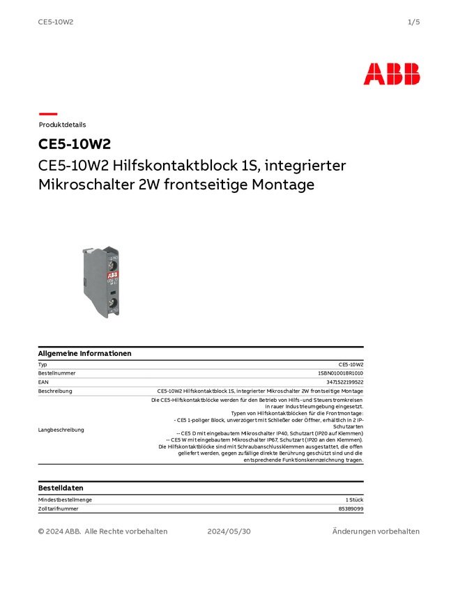 Blok pomocniczy do stycznika ABB CE5-10W2 1 NO 1 szt.