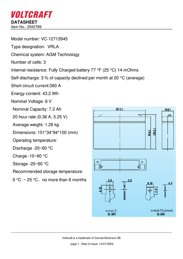 Akumulator ołowiowy VOLTCRAFT CE6V/7Ah VC-12713945, AGM, 6 V, 7.2 Ah