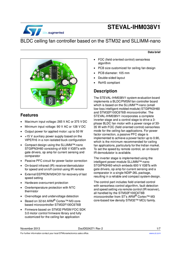 BLDC ceiling fan controller based on STM32 and SLLIMM-nano