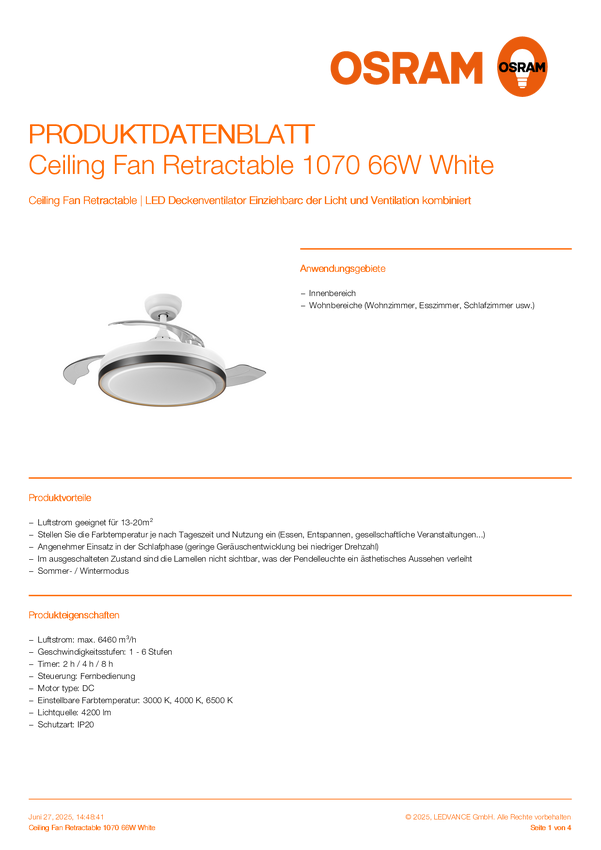 OSRAM HOMELIGHTING Ceiling Fan Retractable 1070 66W White Wentylator sufitowy 66 W