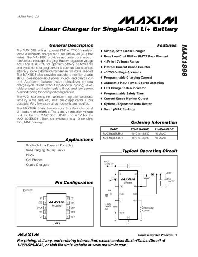 MAX1898 Linear Charger for Single-Cell Li+ Battery