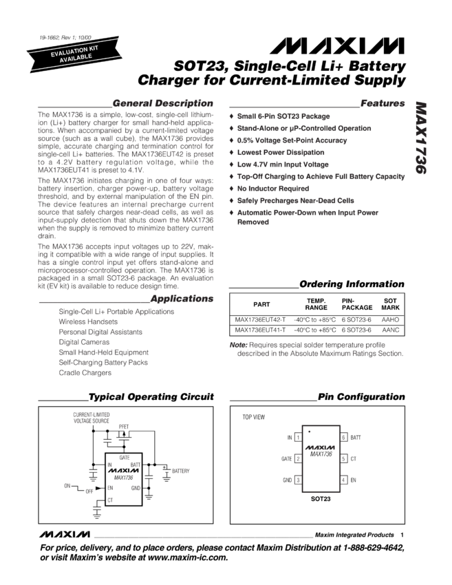 MAX1736 SOT23, Single-Cell Li+ Battery Charger for Current-Limited Supply
