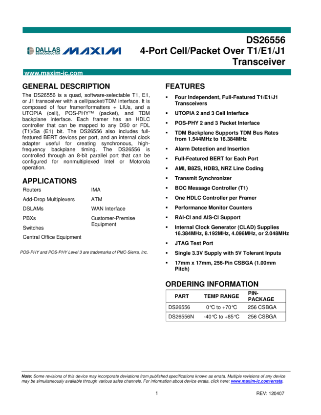 DS26556 4-Port Cell/Packet Over T1/E1/J1 Transceiver