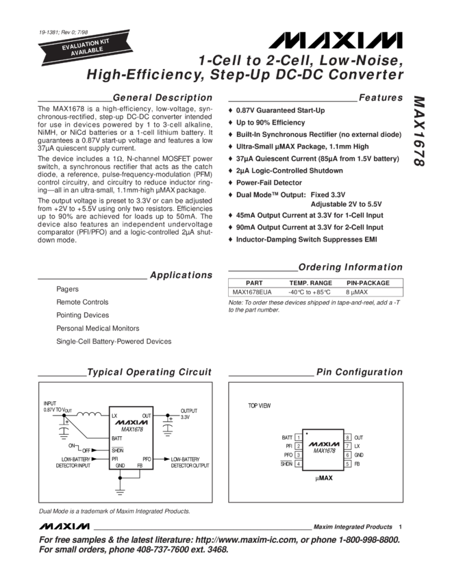 MAX1678 1 Cell to 2 Cell, Low-Noise, High-Efficiency, Step-Up DC-DC Converter