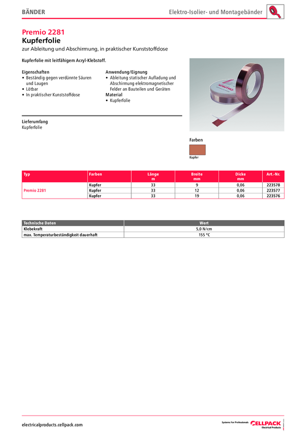Taśma miedziana CellPack Premio 2281 223577 Cellpack (D x S) 33 m x 12 mm 33 m 1 szt.