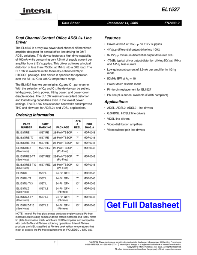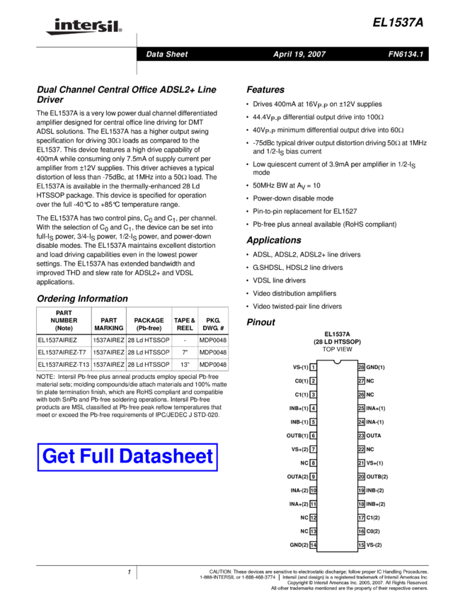 Dual Channel Central Office ADSL2+ Line Driver