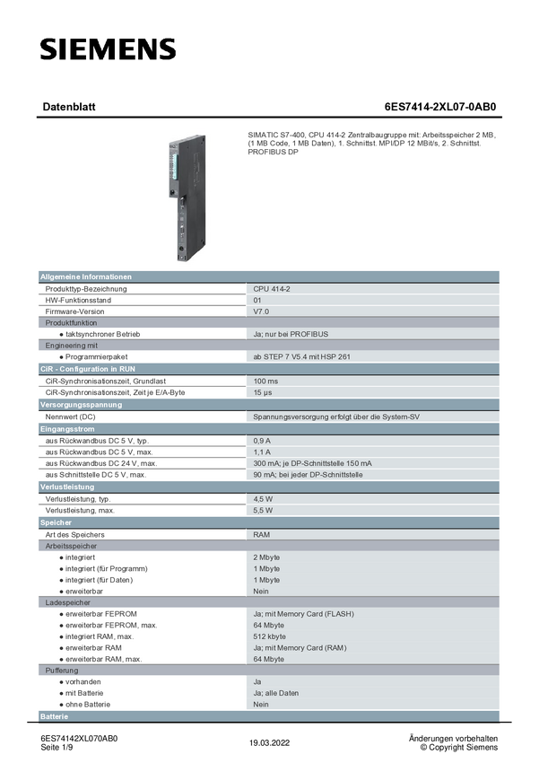 Jednostka centralna PLC Siemens 6ES7414-2XL07-0AB0 6ES74142XL070AB0, 1 szt.
