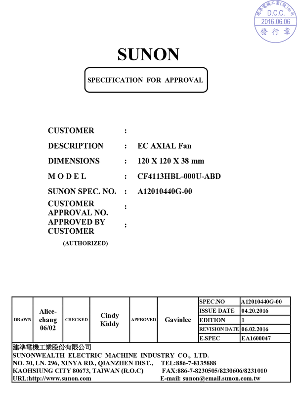 Wentylator osiowy Sunon CF4113HBL-000U-ABD, 230 V/AC, 185.14 m³/h, (D x S x W) 120 x 120 x 38 mm