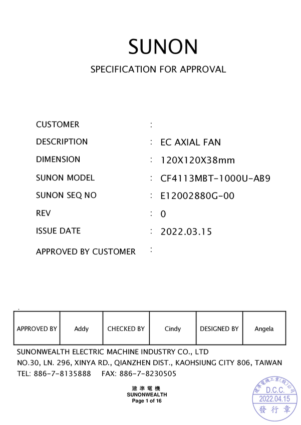 Wentylator osiowy Sunon CF4113LBL-000U-ABD, 230 V/AC, 109.22 m³/h, (D x S x W) 120 x 120 x 38 mm
