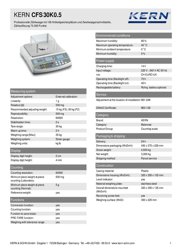 Kern CFS 30K0.5 Waga licząca Zakres pomiaru maks. 30 kg Podziałka 0.5 g z sieci elektrycznej, akumulatorowe srebrny