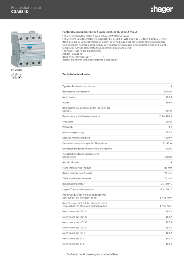 Wyłącznik różnicowoprądowy Hager CGA684D, 4 styki, 100 A, 0.5 A, 400 V