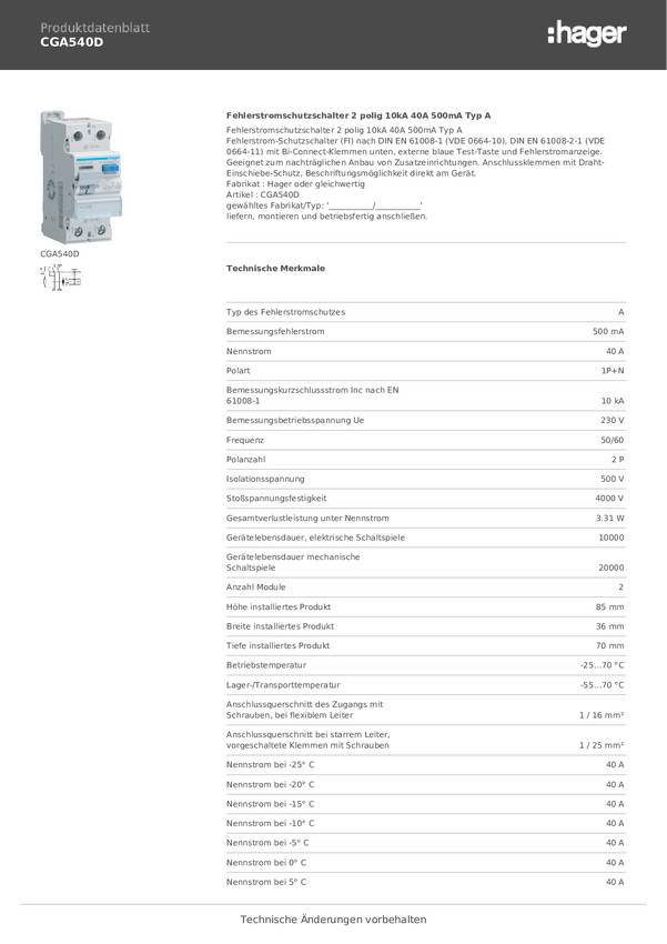 Wyłącznik różnicowoprądowy Hager CGA540D, 2 styki, 40 A, 0.5 A, 230 V
