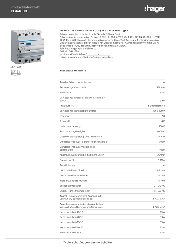 Hager CGA663D Wyłącznik różnicowoprądowy A 4 styki 63 A 0.5 A 400 V