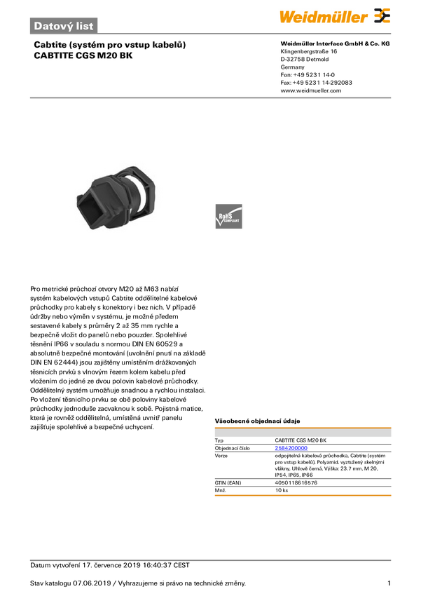 Weidmüller 2584200000 Dławnica kablowa CABTITE CGS M20 BK, M20, 10 szt.