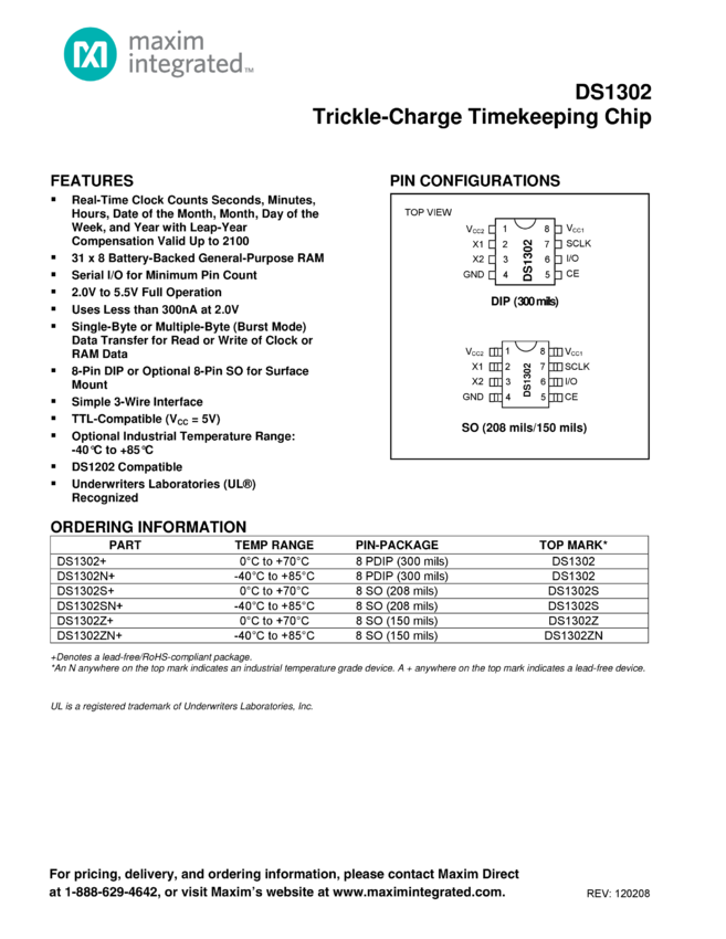 DS1390, DS1391, DS1392, DS1393, DS1394 Low-Voltage SPI/3-Wire RTCs with Trickle Charger