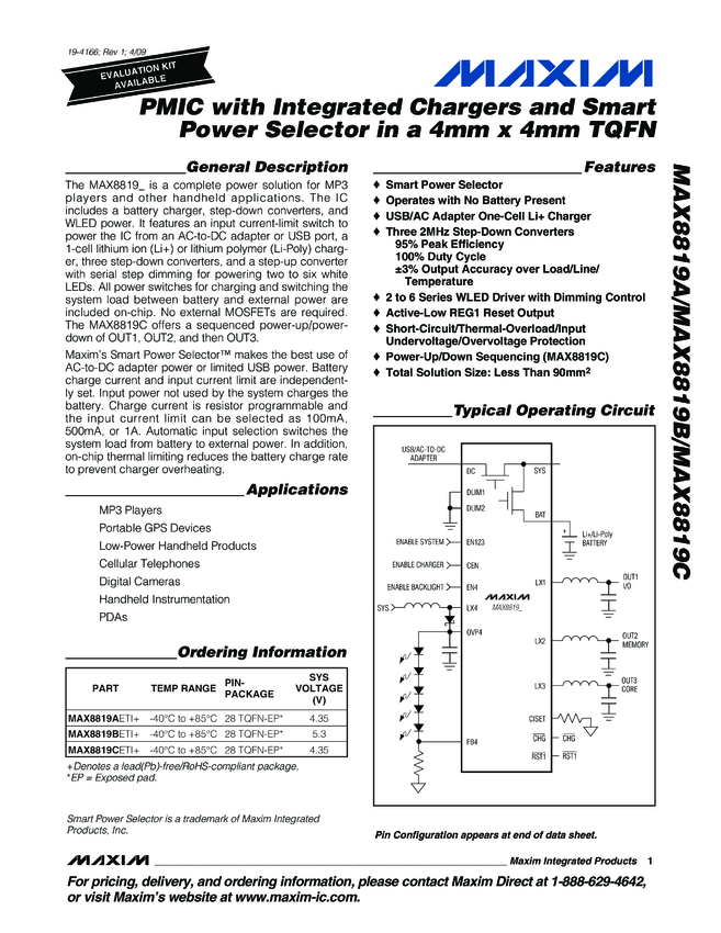 MAX8819, MAX8819A, MAX8819B, MAX8819C PMIC with Integrated Charger and Smart Power Selector™ in a 4mm x 4mm TQFN