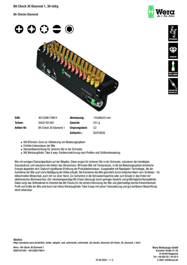 Bity Wera Bit-Check 30 Diamond 1 05057431001 1 szt. płaski, krzyżakowy Pozidriv, krzyżakowy Phillips, TORX wewnętrzny
