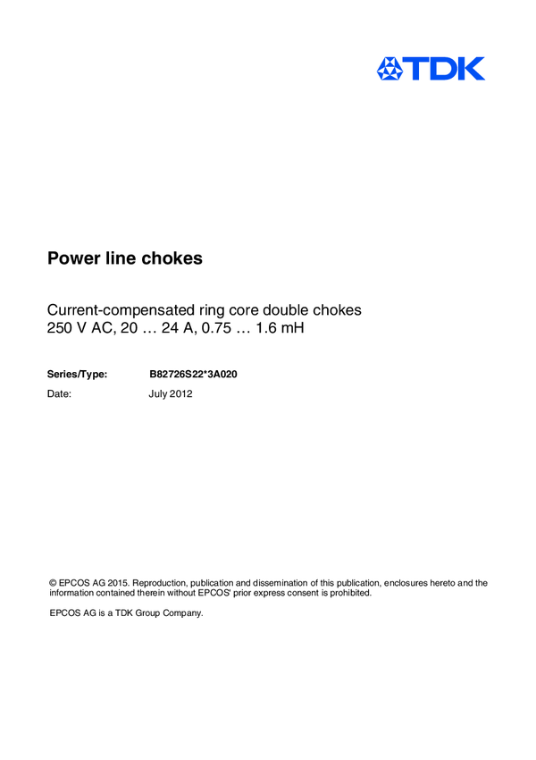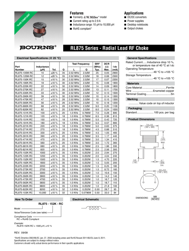 Ind Power Line Choke 750uH -30 to 50% 100KHz Ferrite 24A RDL Bulk