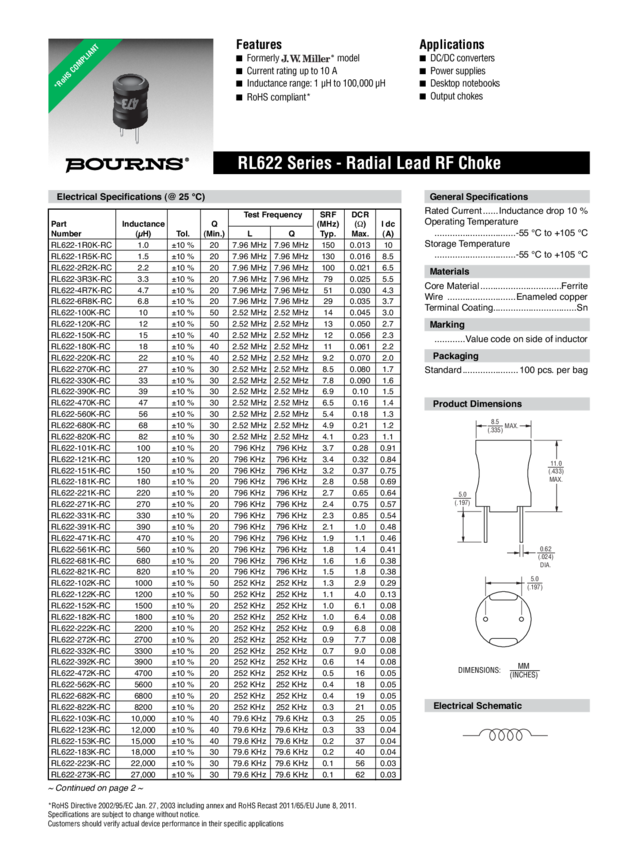 Ind Choke 1mH -30% to 50% 100KHz Ferrite 500mA Blister T/R