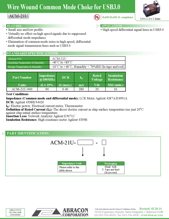 COMMON MODE CHOKE FOR USB3.0, 280MA, 0.4, 90@100HZ, 2 LINE