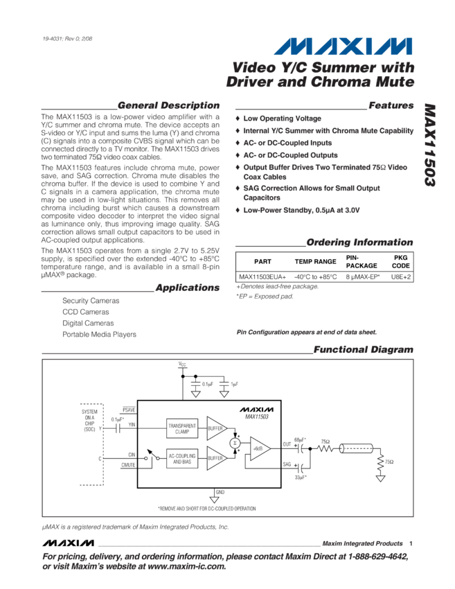 MAX11503 Video Y/C Summer with Driver and Chroma Mute