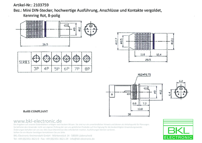 BKL Electronic 0212014 Złącze męskie DIN miniaturowe złącze męskie proste Ilość styków: 8 chrom 1 szt.