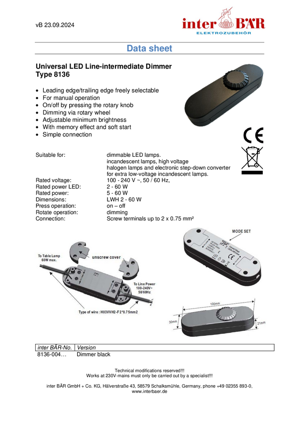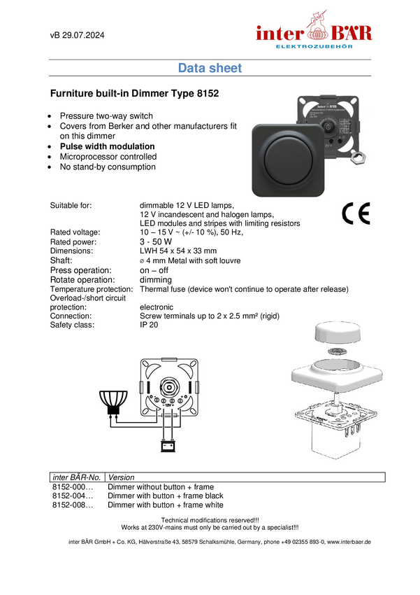 interBär 8152-008.01 Ściemniacz do zabudowy w meblach biały