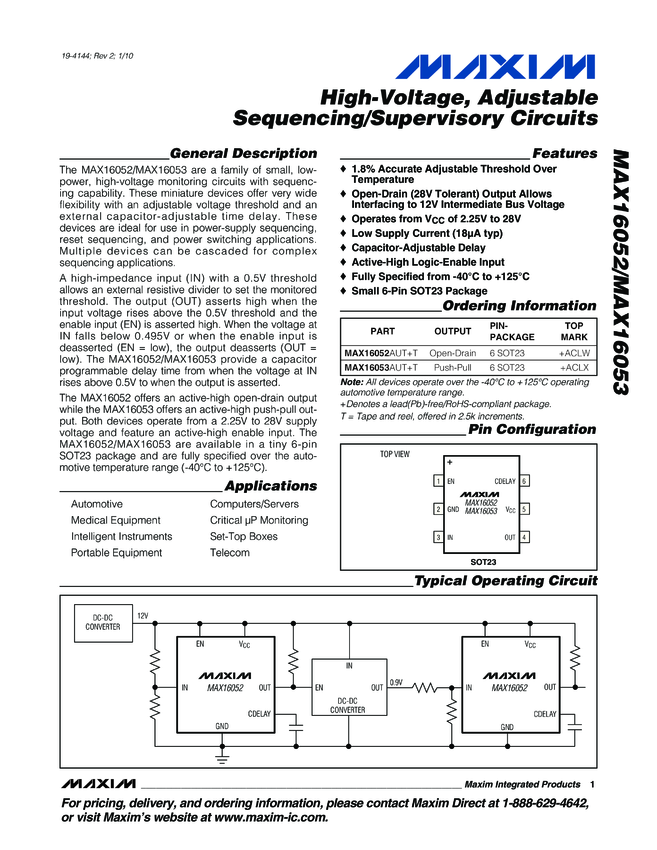 MAX16052, MAX16053 High-Voltage, Adjustable Sequencing/Supervisory Circuits