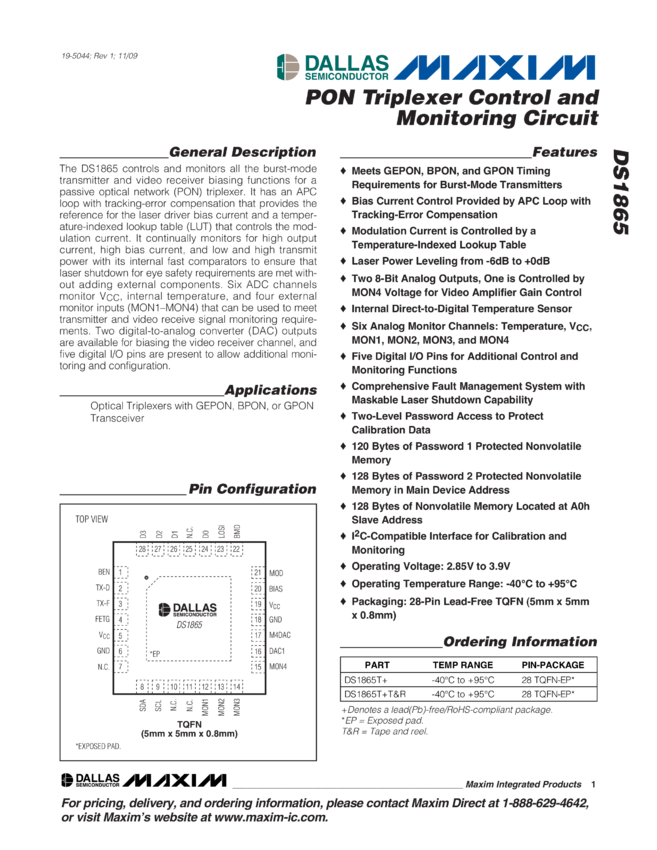DS1865 PON Triplexer Control and Monitoring Circuit