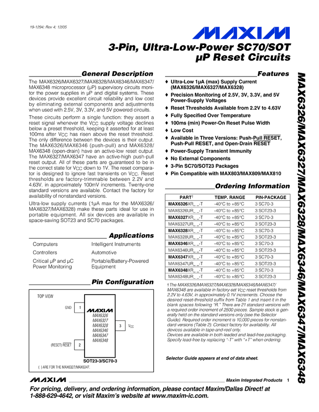 MAX6326, MAX6327, MAX6328, MAX6346, MAX6347, MAX6348 3-Pin, Ultra-Low-Power SC70/SOT µP Reset Circuits