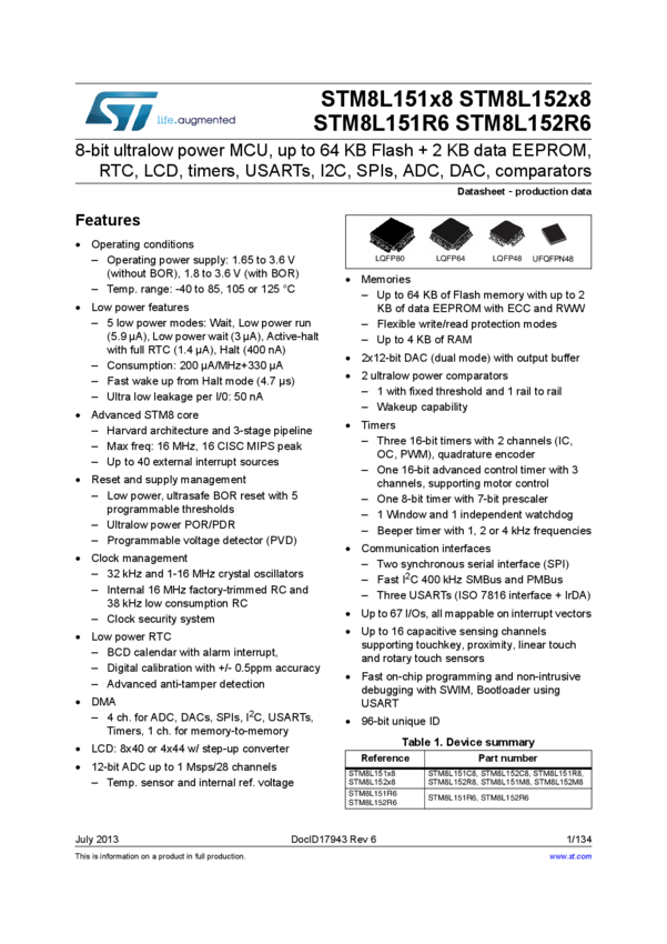 MCU 8-bit STM8L STM8 CISC 64KB Flash 3V 48-Pin LQFP Tray