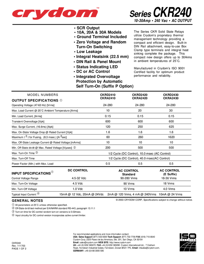 Control Voltage: 4,35-32V DC; Switching voltage type - AC; Zero cross; load voltage 24-280 V RMS; 10 A Proponujemy CKRD2420.. lub CKRD2430.. lub CKRD2430P DIN Rail & Panel Mount