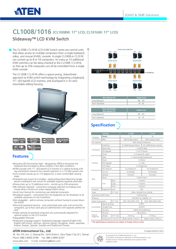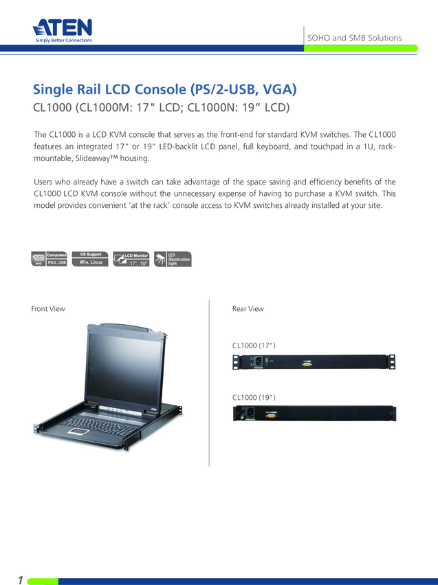 Konsola KVM ATEN CL1000M, 1920 x 1200 Pixel, Ilość przełączalnych PC: 1
