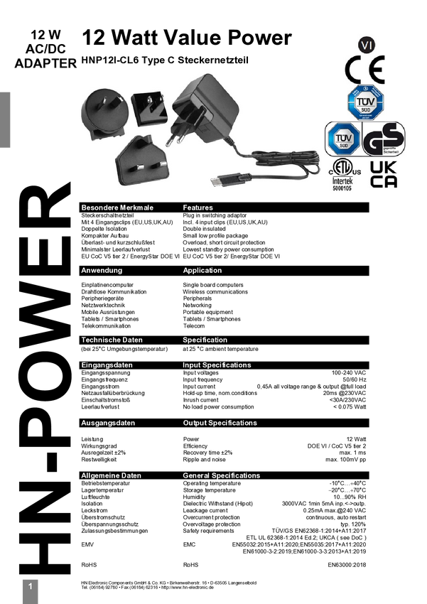 Zasilacz wtyczkowy, stałonapięciowy HN Power HNP12I-CL6 2.4 A 12 W