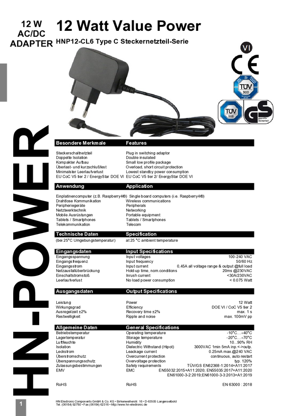 Zasilacz wtyczkowy, stałonapięciowy HN Power HNP12-CL6 2.4 A 12 W