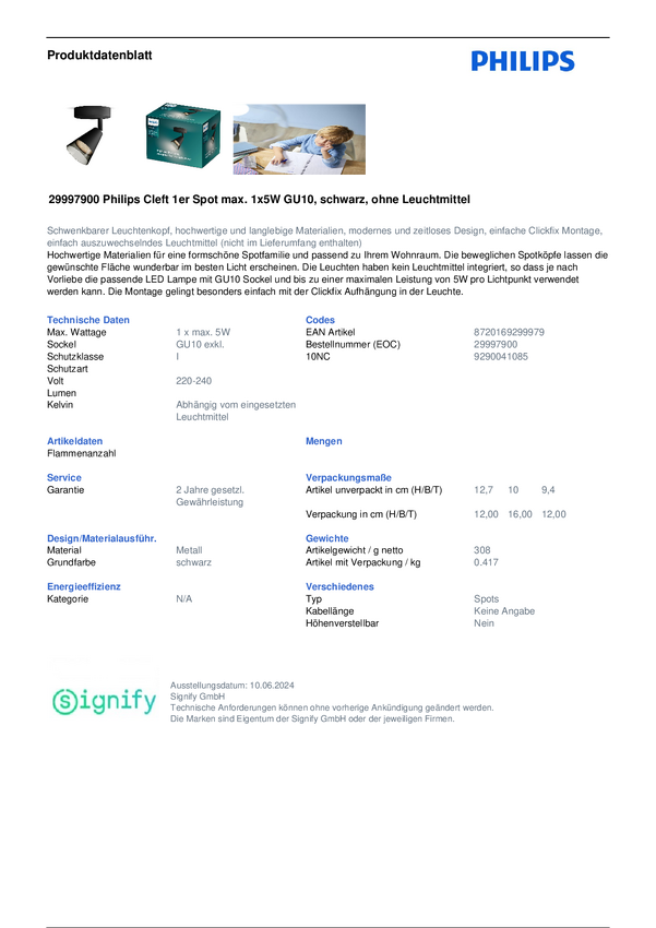 Lampa punktowa, sufitowa Philips Cleft 8720169300019 230 V GU10