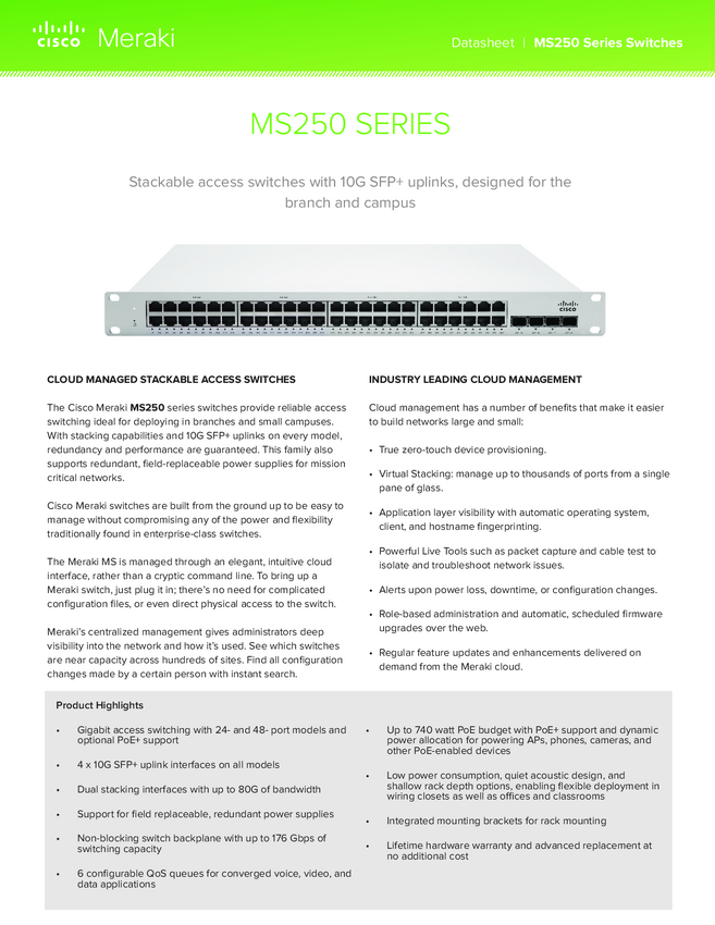 Cisco Cloud Managed MS250-48 - Switch - L3 - Zarządza - 48x10 / 100/1000 + 4 - Switch - 1 Gbps