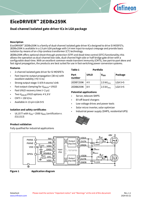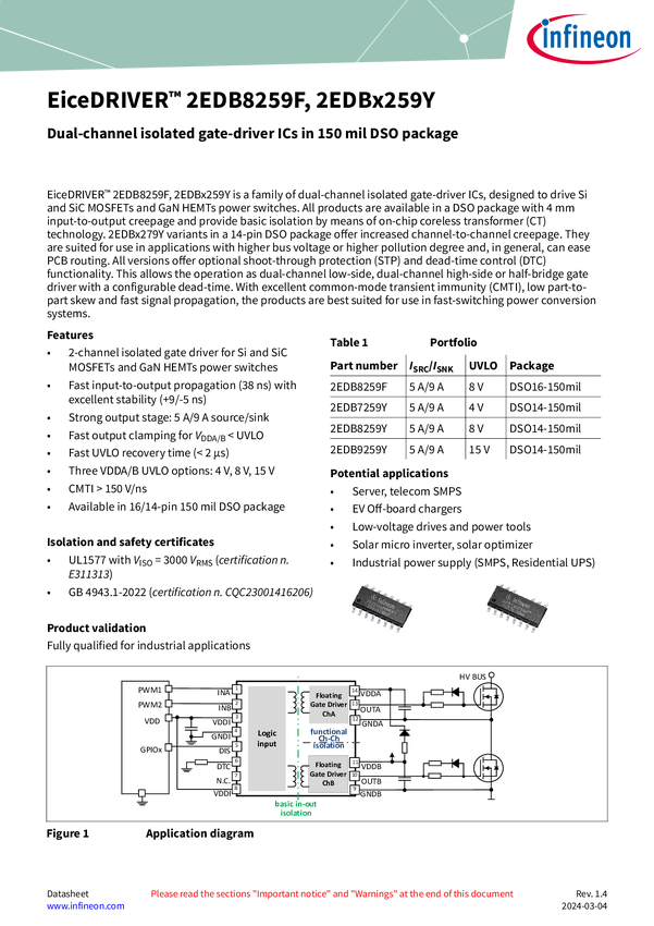 Fast, robust, dual-channel, reinforced isolated MOSFET gate drivers with accurate and stable timing The EiceDRIVER™ 2EDR8259H is a reinforced isolated gate driver IC for control over the mandatory safe isolation barrier in SMPS. The strong 5 A/9A source/sink gate driver features a high 150V/ns CMTI for robust operation with CoolMOS™, CoolGaN™ GIT HEMTs and high-power switching noise environment. The short propagation delay of 38ns is provided with low variation over temperature, enabling the power system d