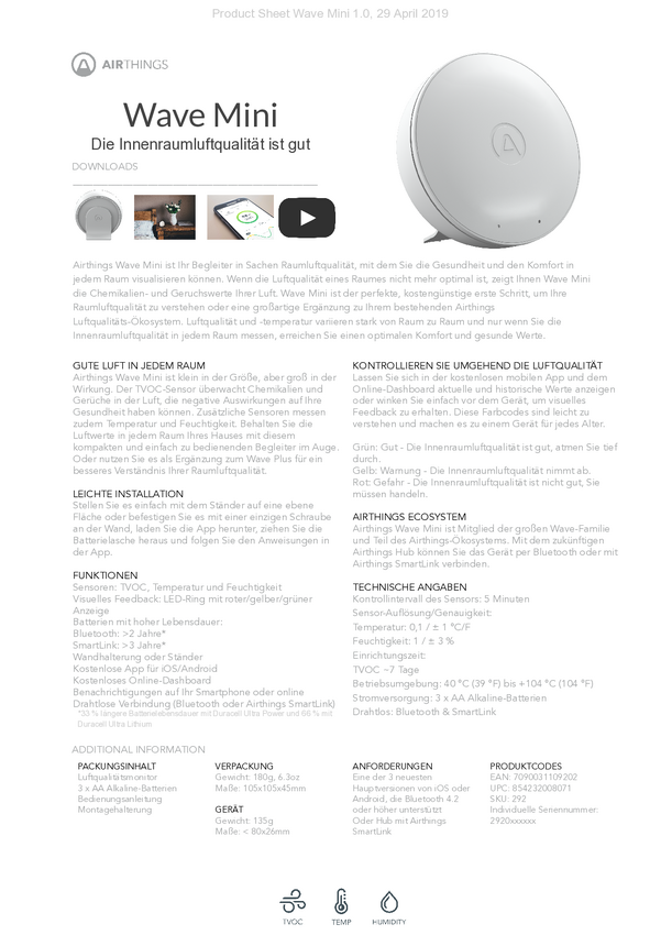 Airthings Wave Mini Czujnik CO2 do sygnalizacji świetlnej / jakości powietrza bateryjne