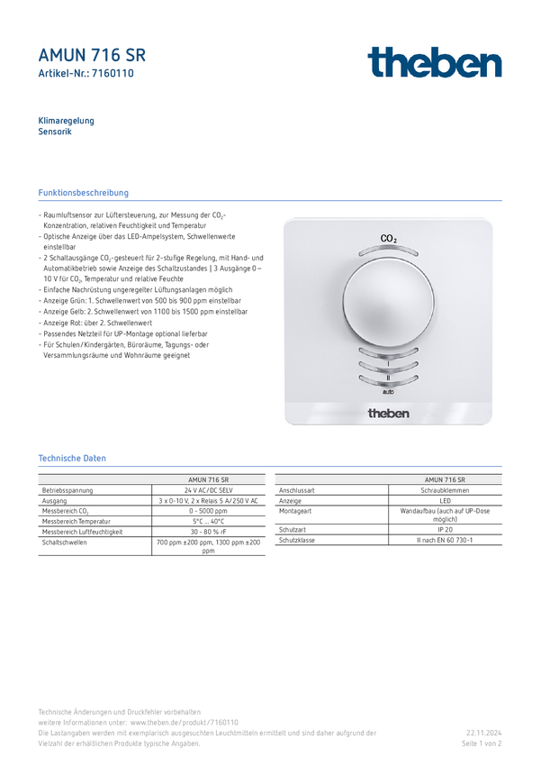 Czujnik jakości powietrza CO2 / regulator klimatu w pomieszczeniu Theben 7160110 AMUN 716 SR