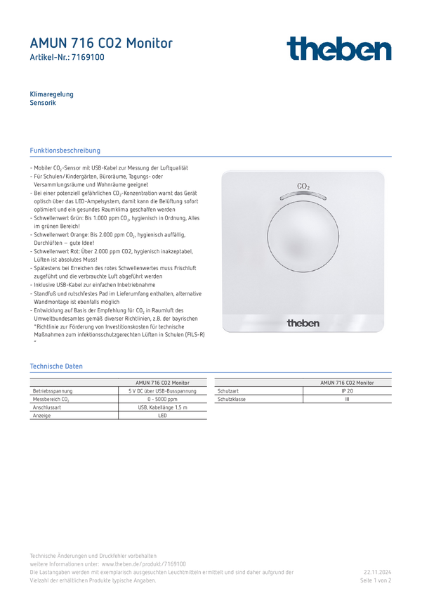 Czujnik jakości powietrza CO2 / regulator klimatu w pomieszczeniu Theben 7169100