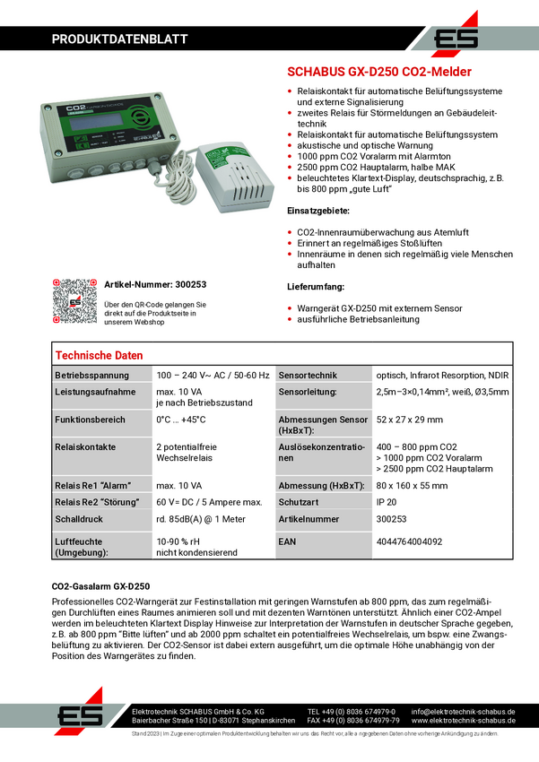 Czujnik CO2 do sygnalizacji świetlnej / jakości powietrza Schabus 300253 1 szt.