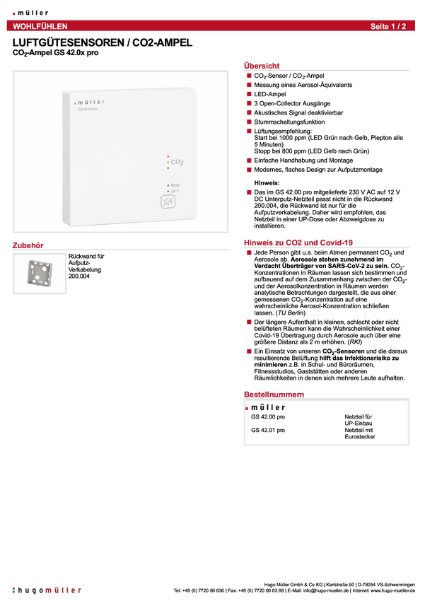 Müller GS 42.01 pro Czujnik CO2 do sygnalizacji świetlnej / jakości powietrza z sieci elektrycznej Wykrywanie Dwutlenek