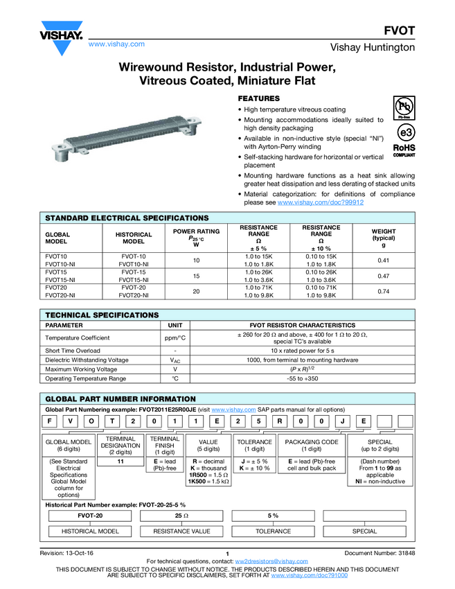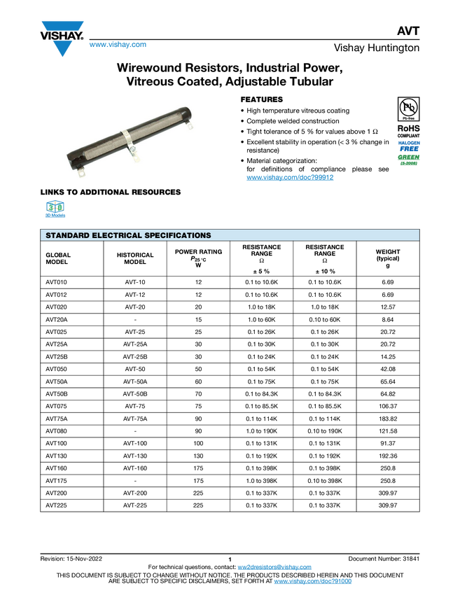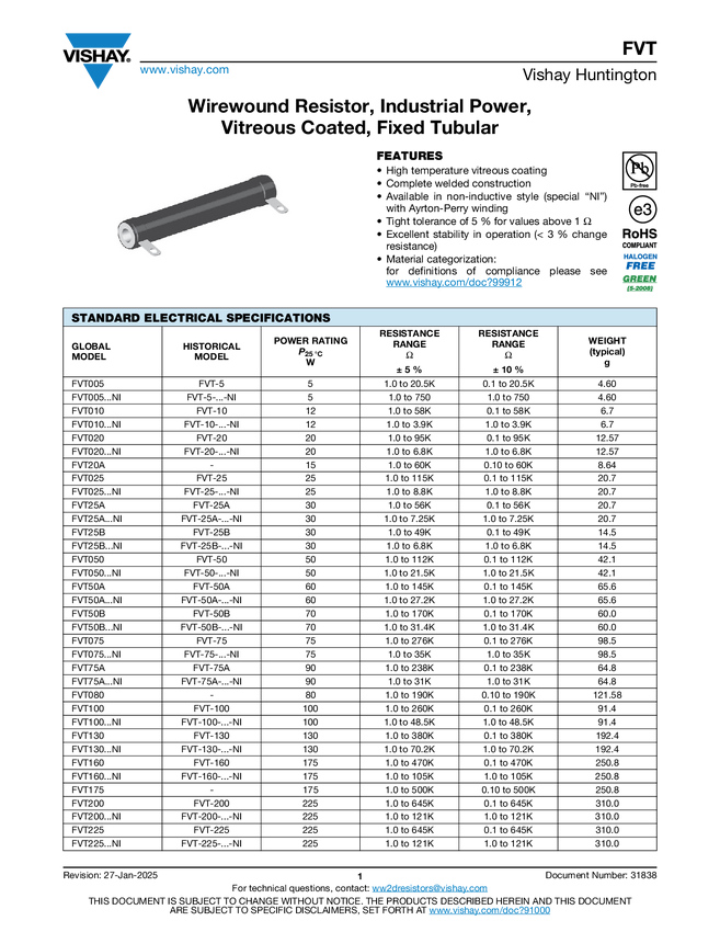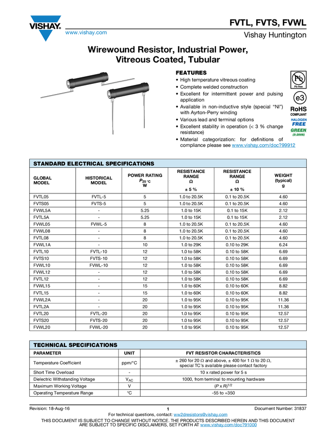 Wirewound Resistors, Industrial Power, Vitreous Coated, Fixed Edgewound Tubular