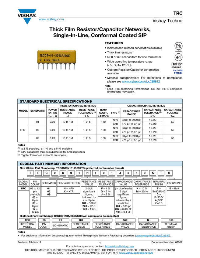 Thick Film Resistor/Capacitor Networks, Single-In-Line, Conformal Coated SIP