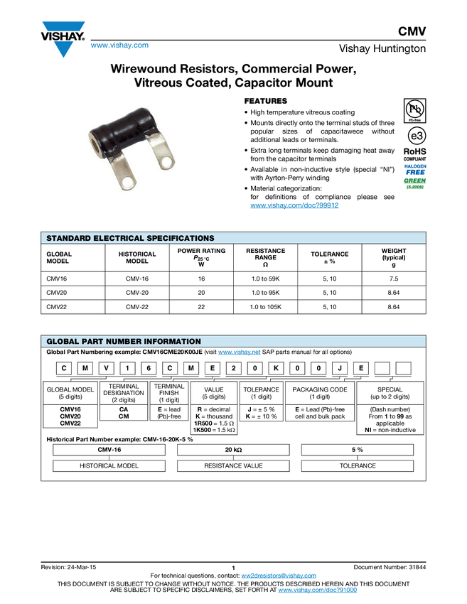 Wirewound Resistors, Commercial Power, Vitreous Coated, Capacitor Mount