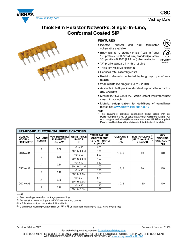 Thick Film Resistor Networks, Single-In-Line, Conformal Coated SIP