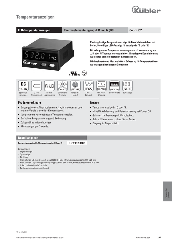 Termometr tablicowy, panelowy Kübler Automation CODIX 532, - 19999 - 99999 °C, Dokładność: Zależny od czujnika